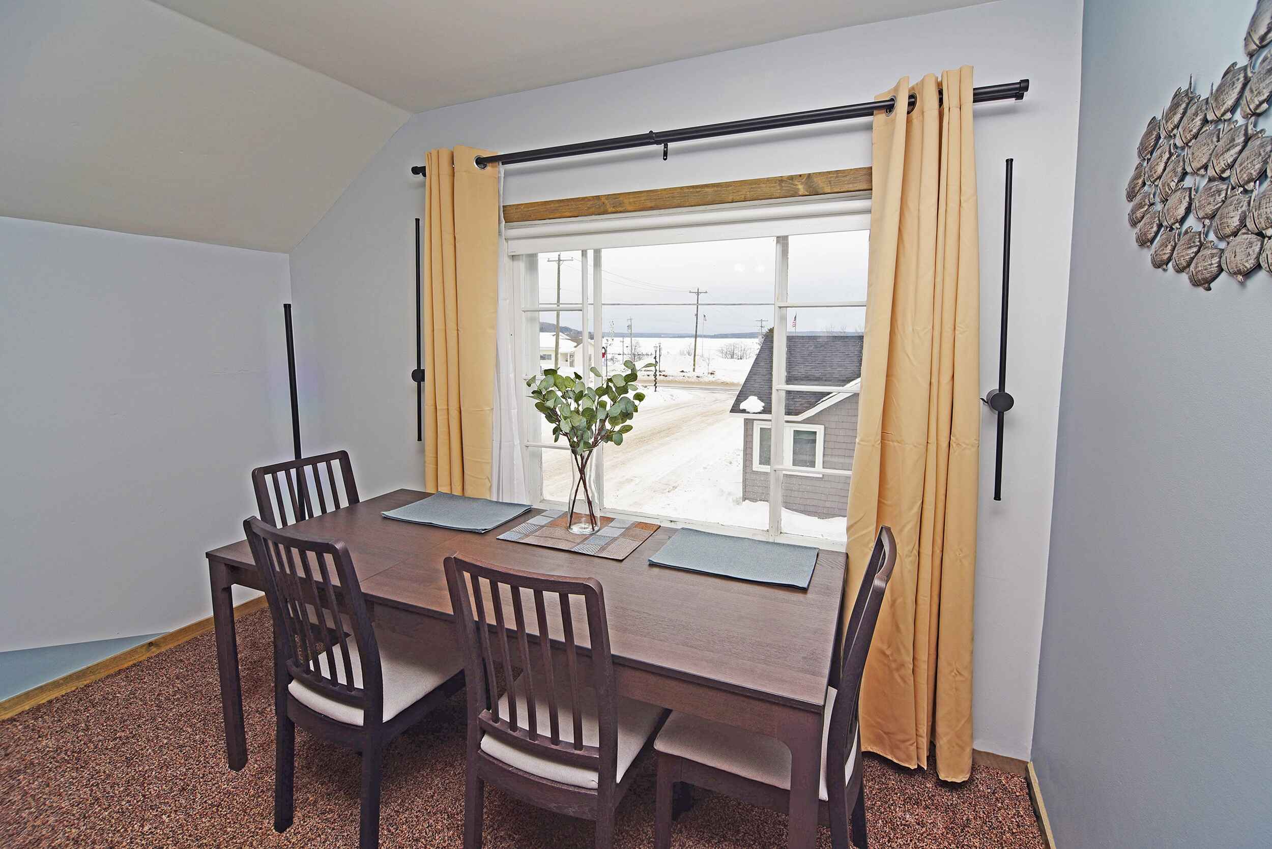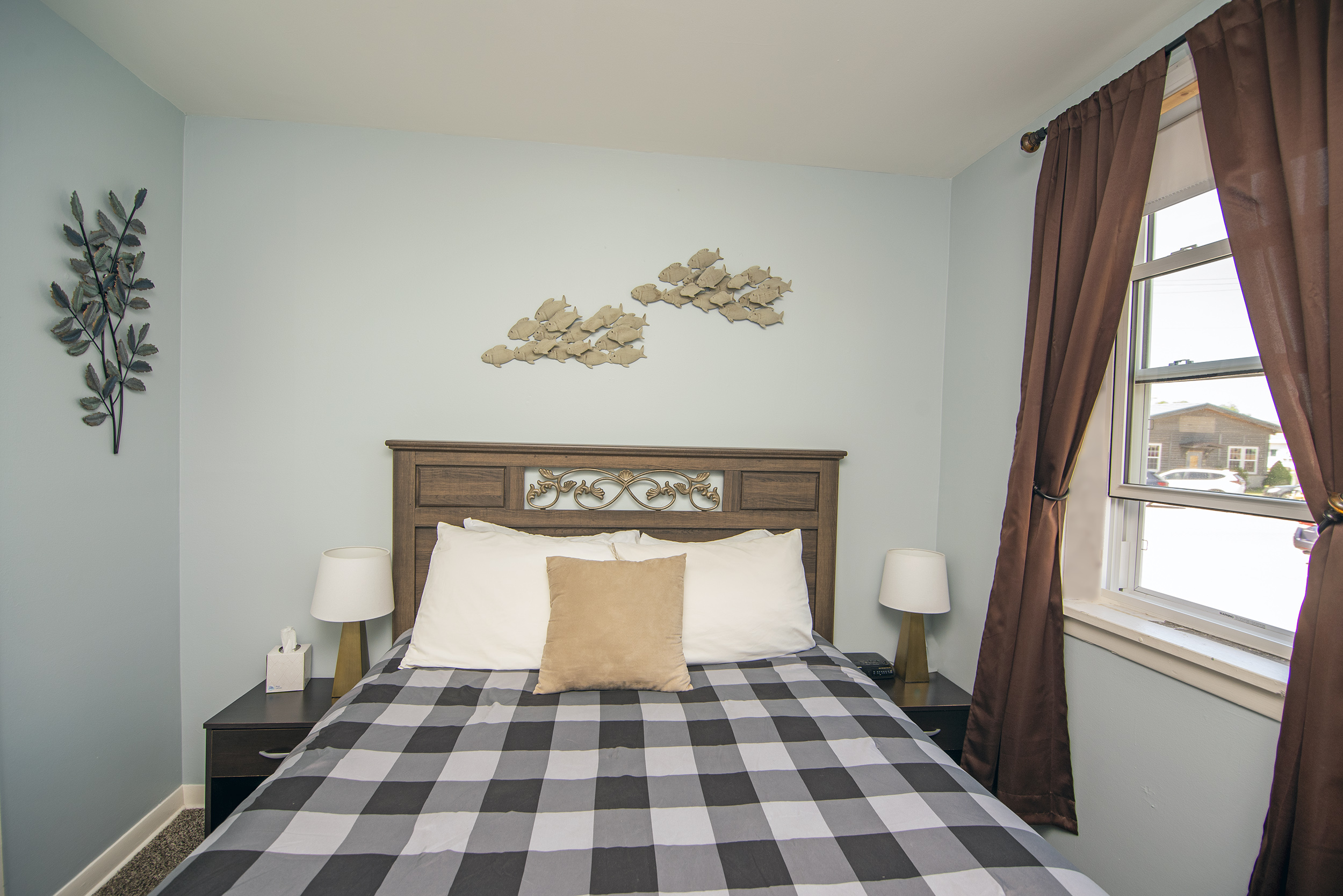 Located on the second floor with a nice view of Munising and Lake Superior. There are two bedrooms; one with a queen bed and the other bedroom is furnished with a set of bunk beds. The comfortable living room has a pull out sofa. There is a priva